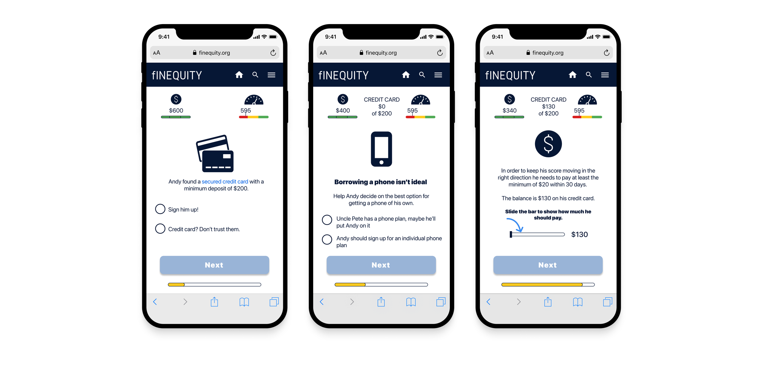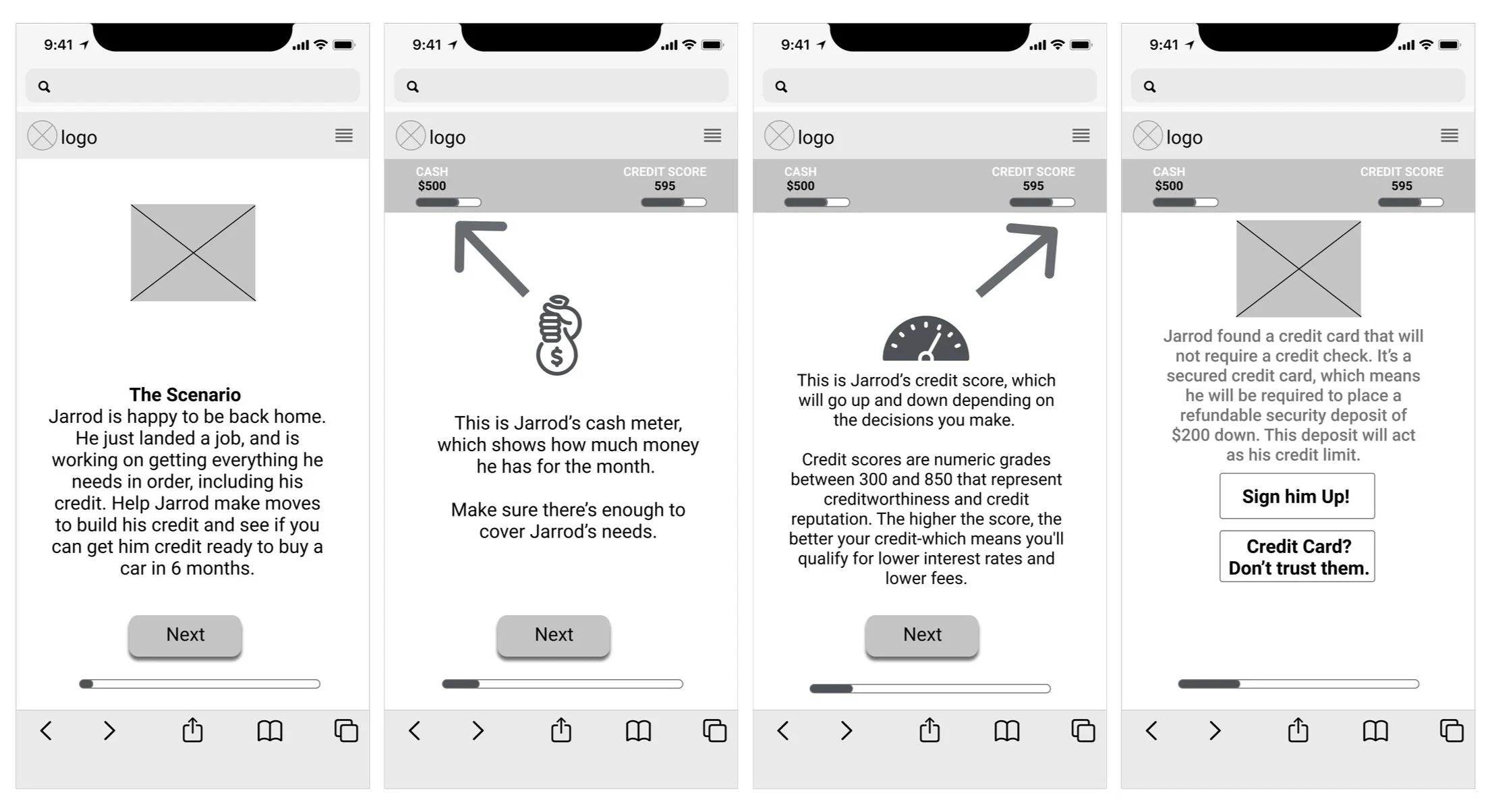 As a result of my research, I transformed sketches into wireframes and performed usability tests to validate the concept. The "Simulator" is a gamified learning activity based on presenting users with common financial decision-making scenarios, giving them the freedom to learn by doing.