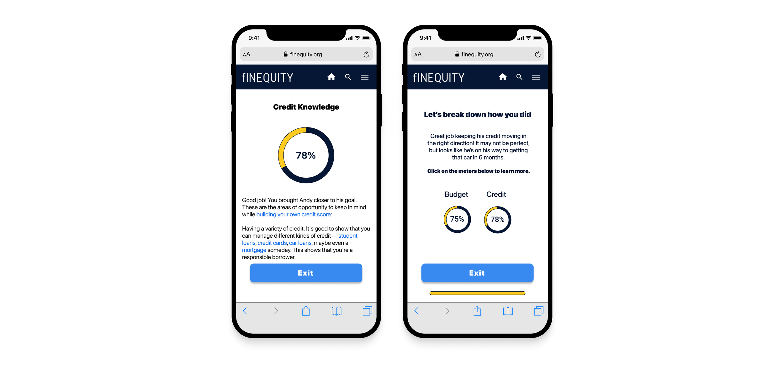 Once the user gets to the end of the activity they receive a summary of their score in each category. Each result component expands to provide more detail on relevant topics and links to dive deeper into financial concepts. By providing this feedback, users are given more information to fill knowledge gaps.